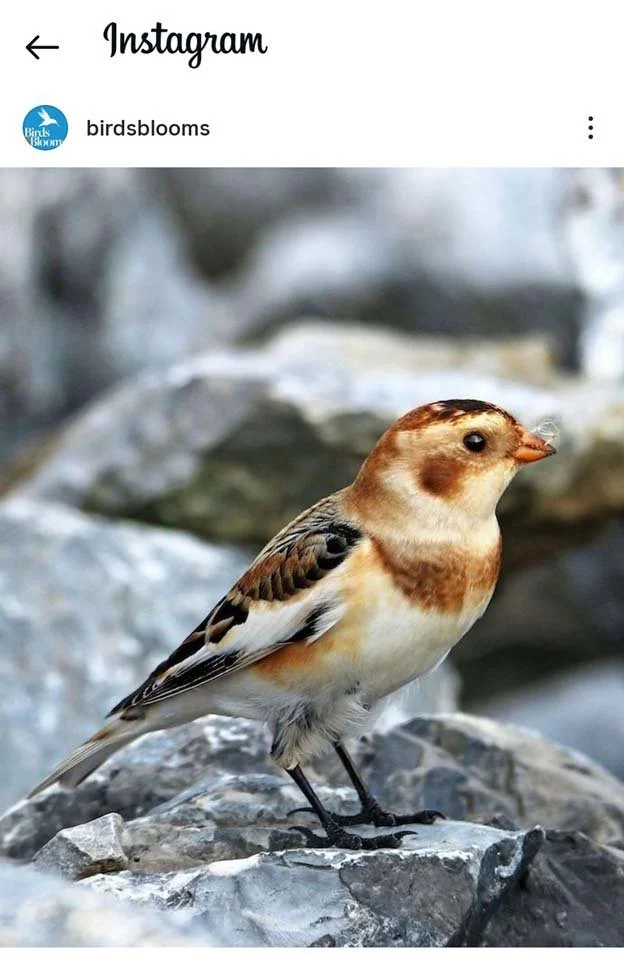 Do you know the line from “ Winter Wonderland” that says, “Gone away is the Bluebird. Here to stay is a new bird?” Well, while Bluebirds often over-winter here now, and the new bird, a Snow Bunting, doesn't stay, it is the bird I think of when I hear this song! Why? Like many of you, I imagine, Snow Buntings were completely unknown to me when I joined Audubon, but it was love at first sight when I was lucky enough to have the experience. Their snowy white under parts and the black and caramel-like coloring on their wings and head were mesmerizing! (For anyone who loves our summer Indigo Bunting, this is its winter relative.)